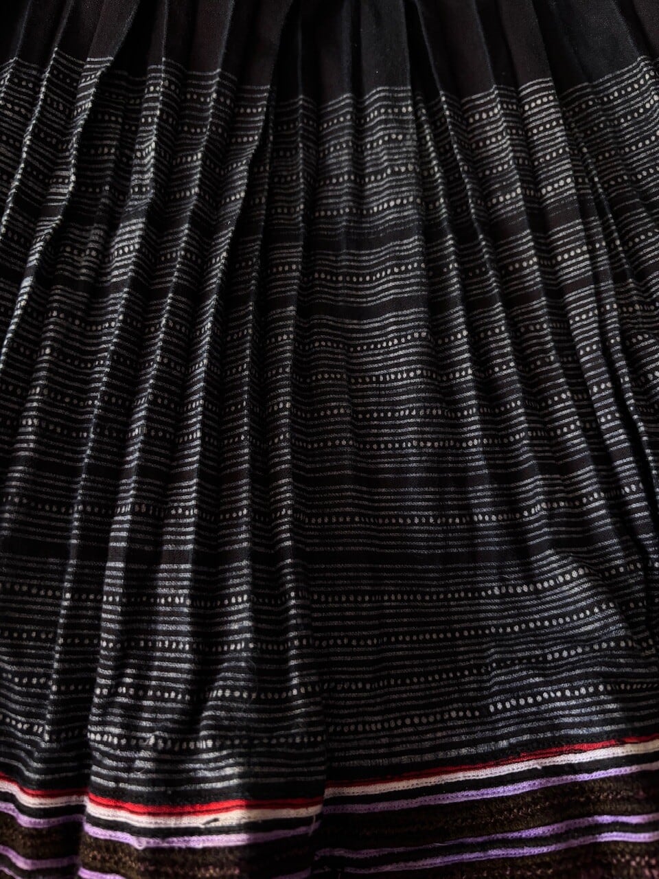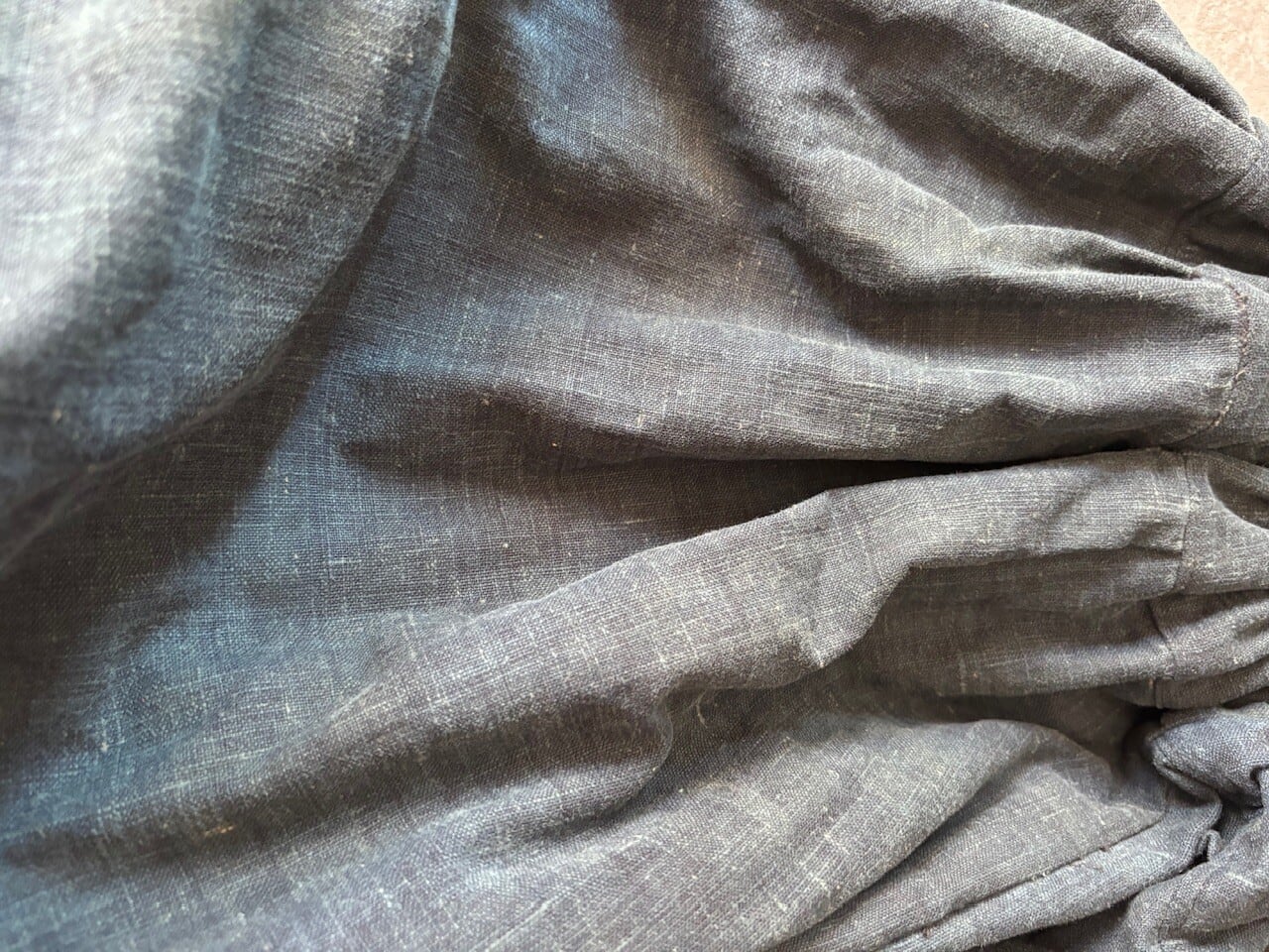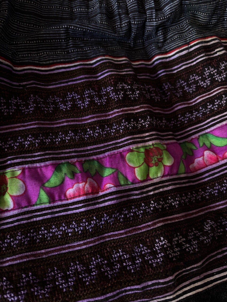 刺繍は黒モン族ならではの細かいクロスステッチの手刺繍で縫われています。一部青色や花柄の生地が入ってアクセントになっています。白いテープ部分は全体的に藍染がうつって染まっています。一番下の裾はベロア生地になっています。