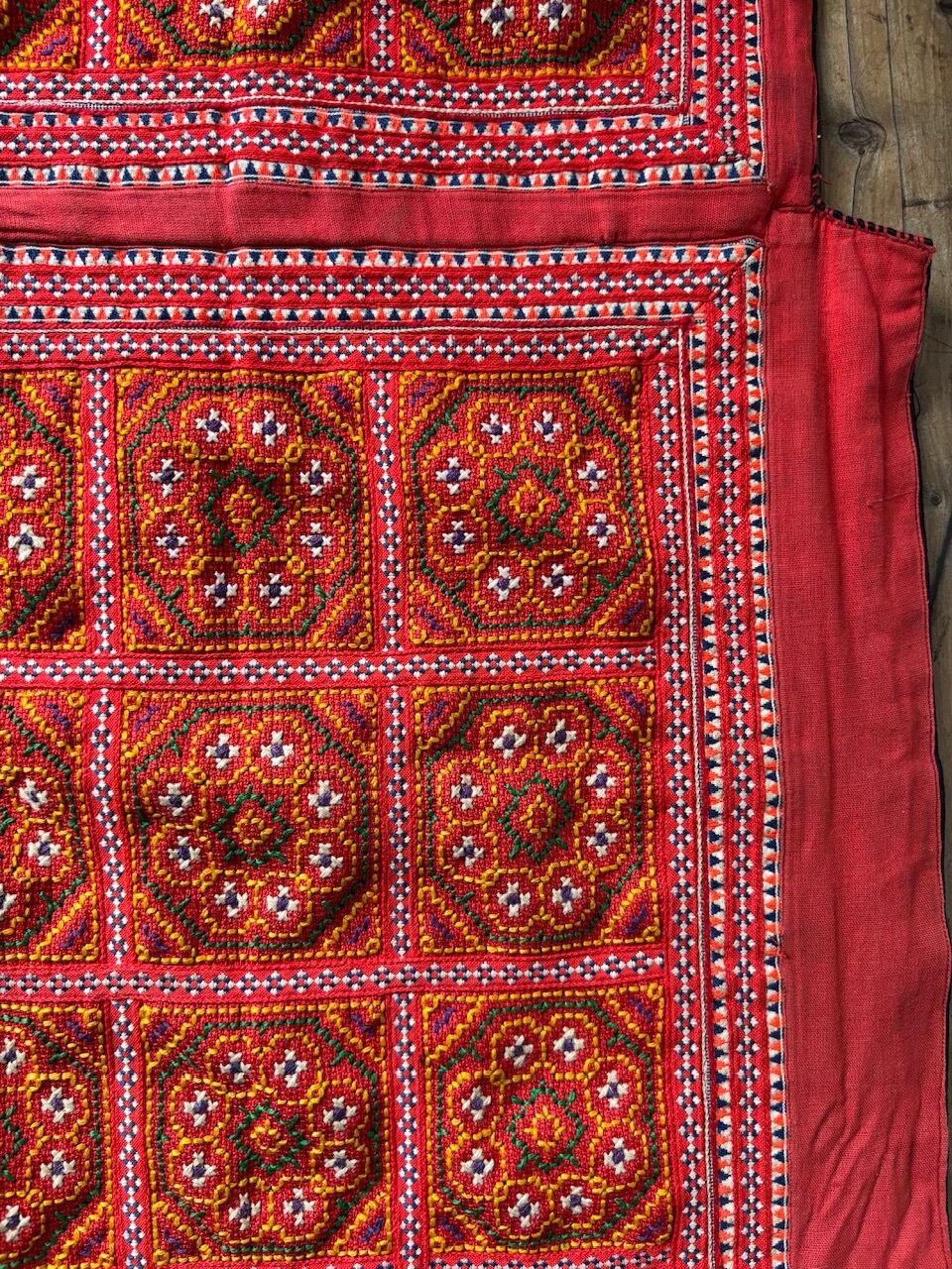 モン族は刺繍を得意とする少数民族です。こちらの生地は鮮やかな暖色系の糸で、細かい文様を布一面にぎっしり手刺繍されており、大変美しいです。クロスステッチ(x字状に縫い合わせていく技法)や周りの模様も細かいサテンステッチ刺繍でデザインされています。