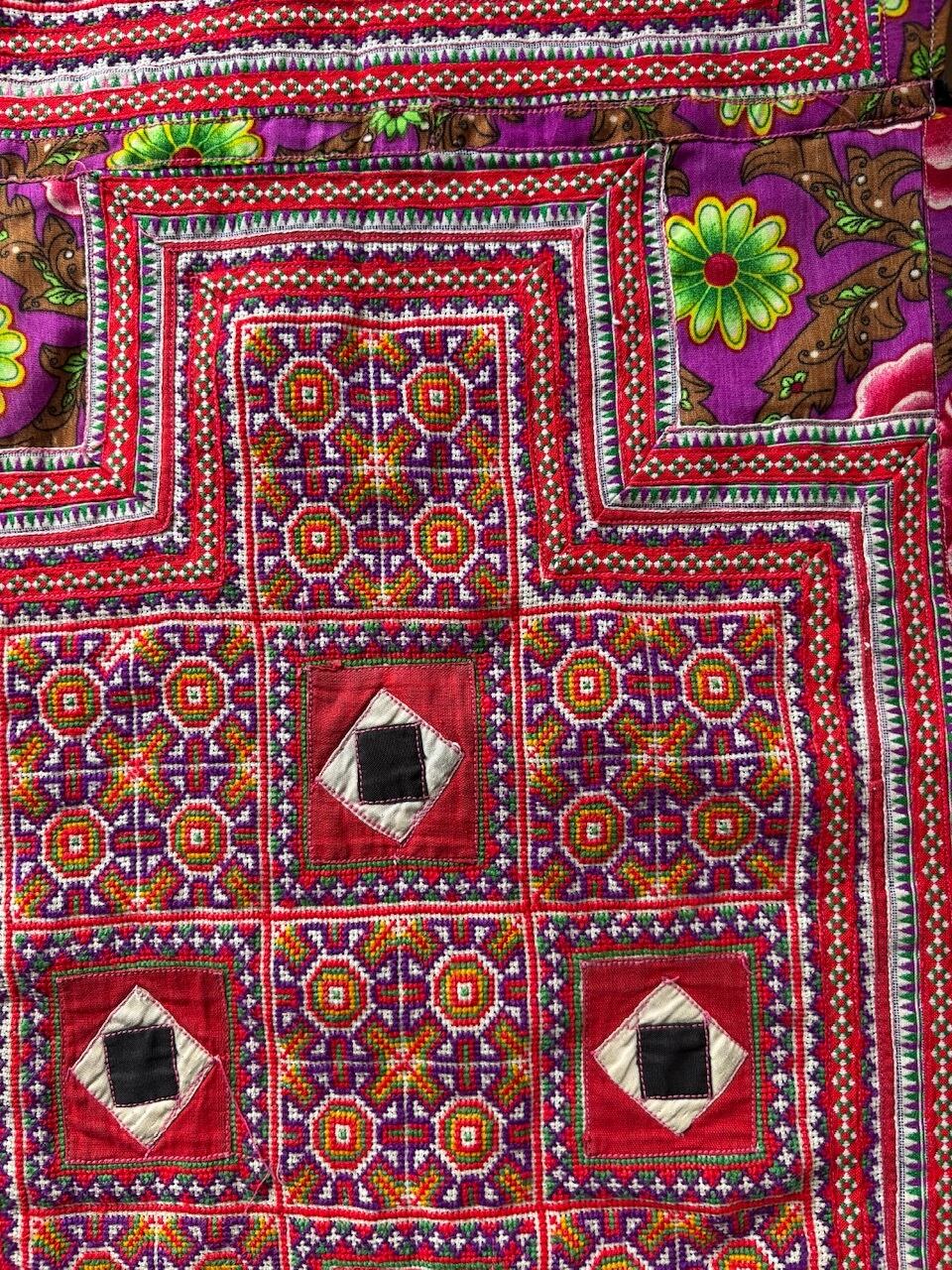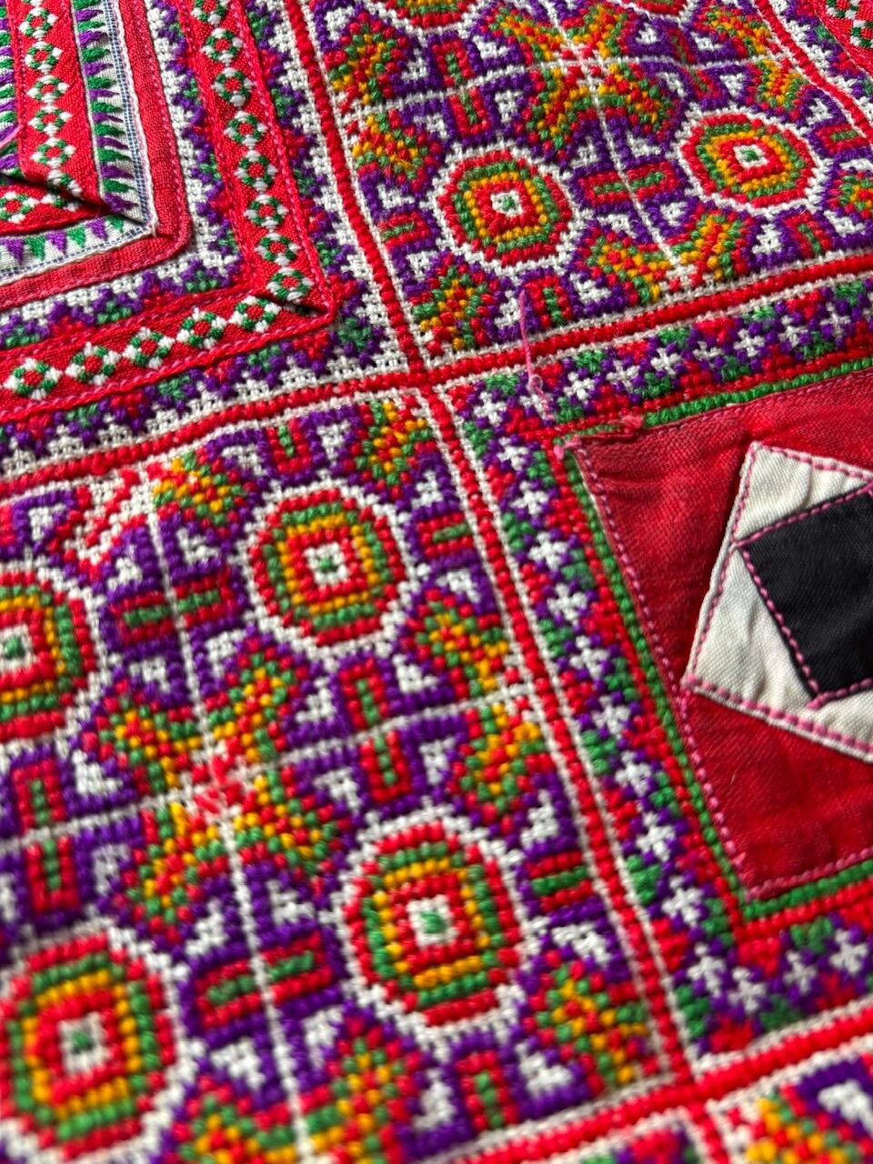 モン族は刺繍を得意とする少数民族です。こちらの生地は細かい文様を布一面にぎっしり手刺繍されており、大変美しいです。サテンステッチ刺繍やアップリケでデザインされています。