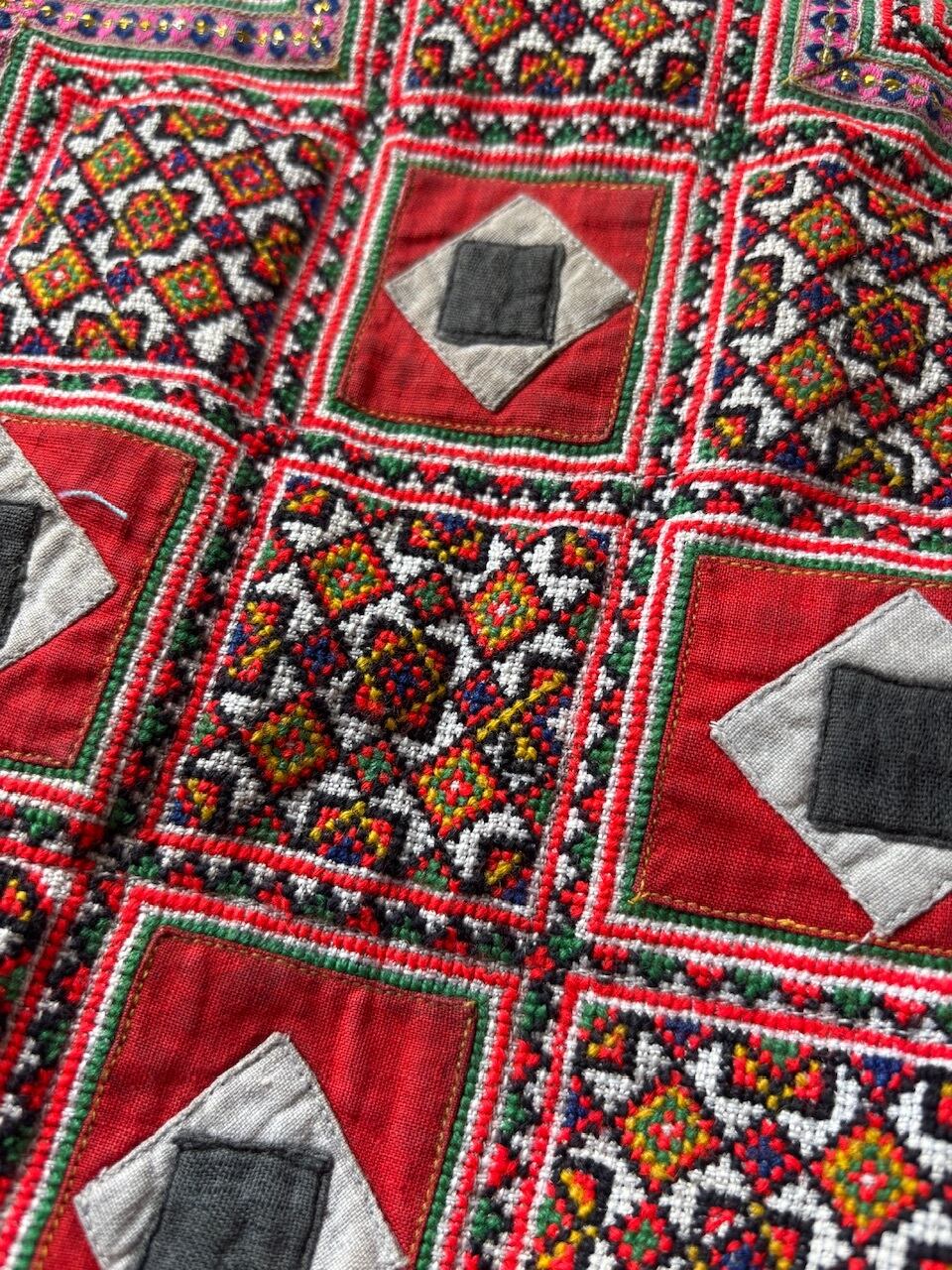 モン族は刺繍を得意とする少数民族です。こちらの生地は、細かい文様を布一面にぎっしり手刺繍されており、大変美しいです。サテンステッチ刺繍やアップリケ、リボンステッチでデザインされています。