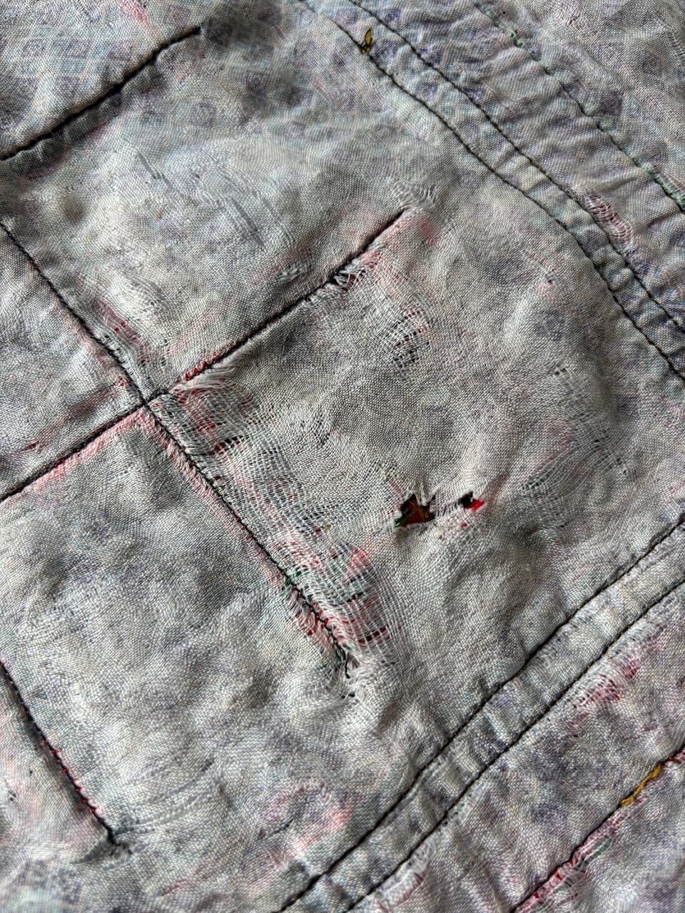 こちらの商品は土台の生地も含め古布感が強い商品です。また裏地もダメージが全体的にあります。民族のビンテージの風合いとしてご理解ください。