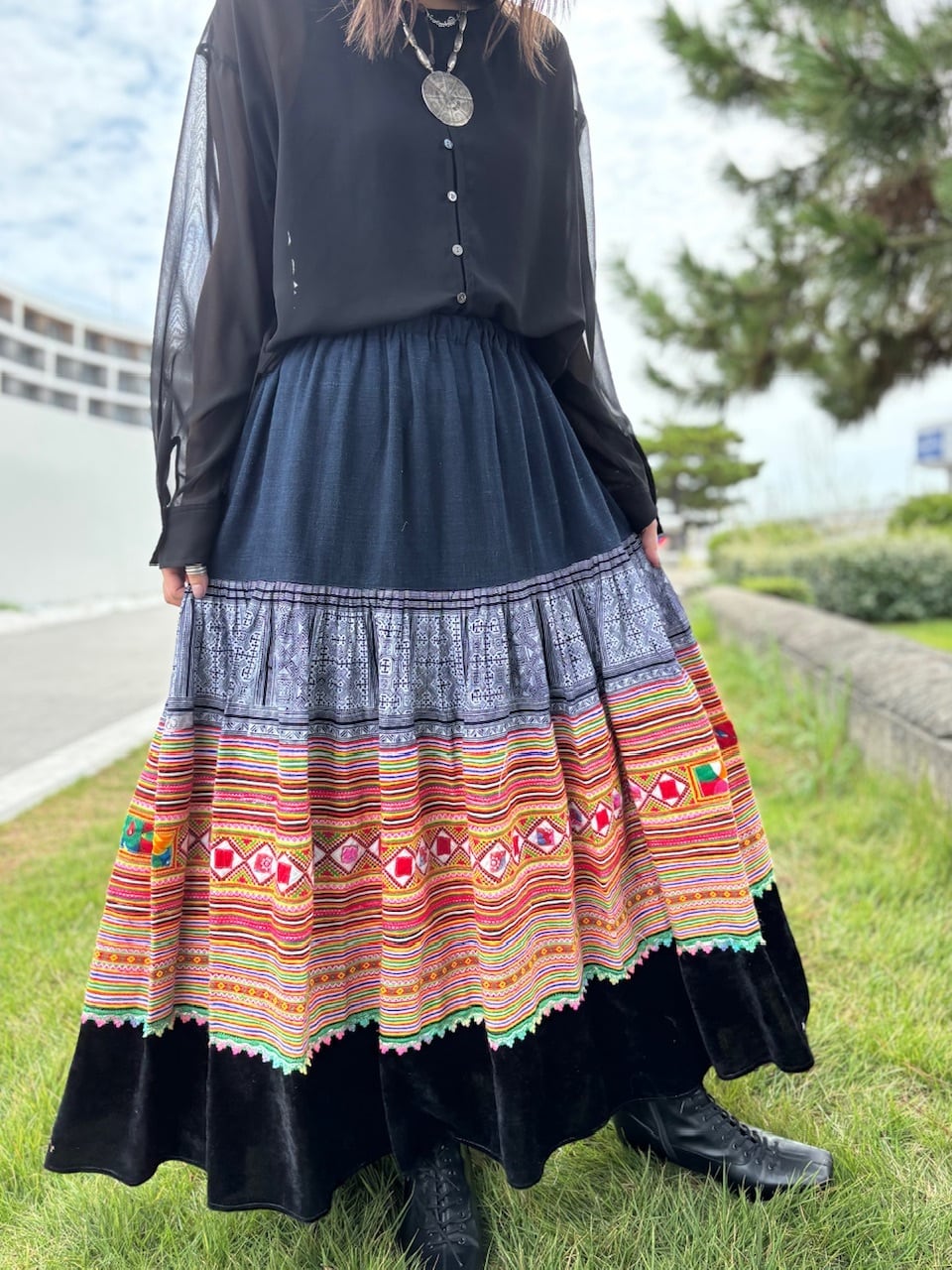 モン族の巻きスカートをリメイクした、ロングスカートです。