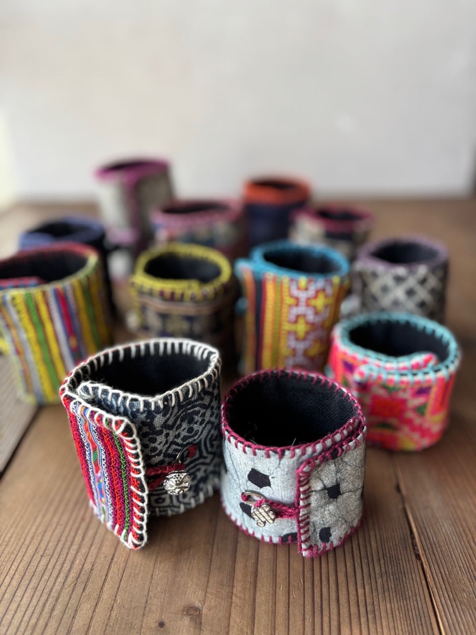 モン族・ザオ族の手刺繍布、ザオティエン族の藍染布 、そしてプイ族の貴重な生地などなど、山岳民族の伝統布をリメイクしたしたハンドメイド商品、ミニバック、アクセサリー、バングル等いろいろ取り揃えております。ひとつひとつ異なる表情を持つ少数民族の布。 民族布ならではの力強い美しさをお楽しみいただけます。