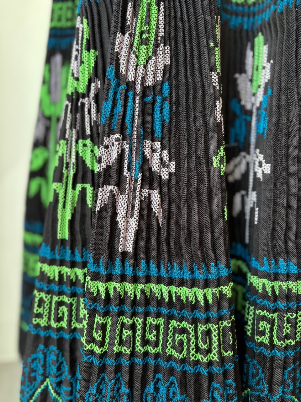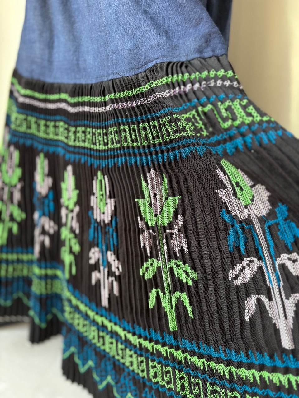 下部はモン族の刺繍の生地です。黒地の生地にクロスステッチでお花や模様が手刺繍で縫われています。下部にボリュームがあるので動きが出やすいと思います。シンプルな色合いなのでどんな服にも合わせやすいスカートです。