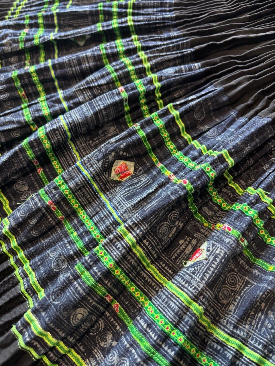 下部はモン族のろうけつ染めの生地をベースに緑のリボンやアップリケで装飾されています。
