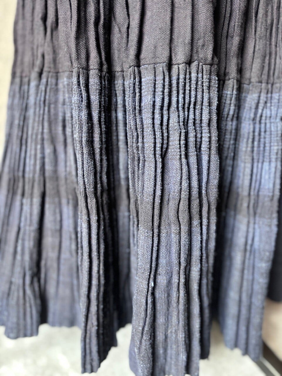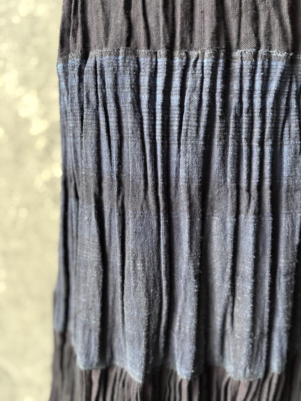 モン族の白黒巻きスカートを藍染で染めたスカートです。巻きスカートを2段に組み合わせで制作しています。渋い古布感のある一枚です。