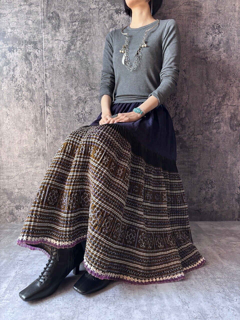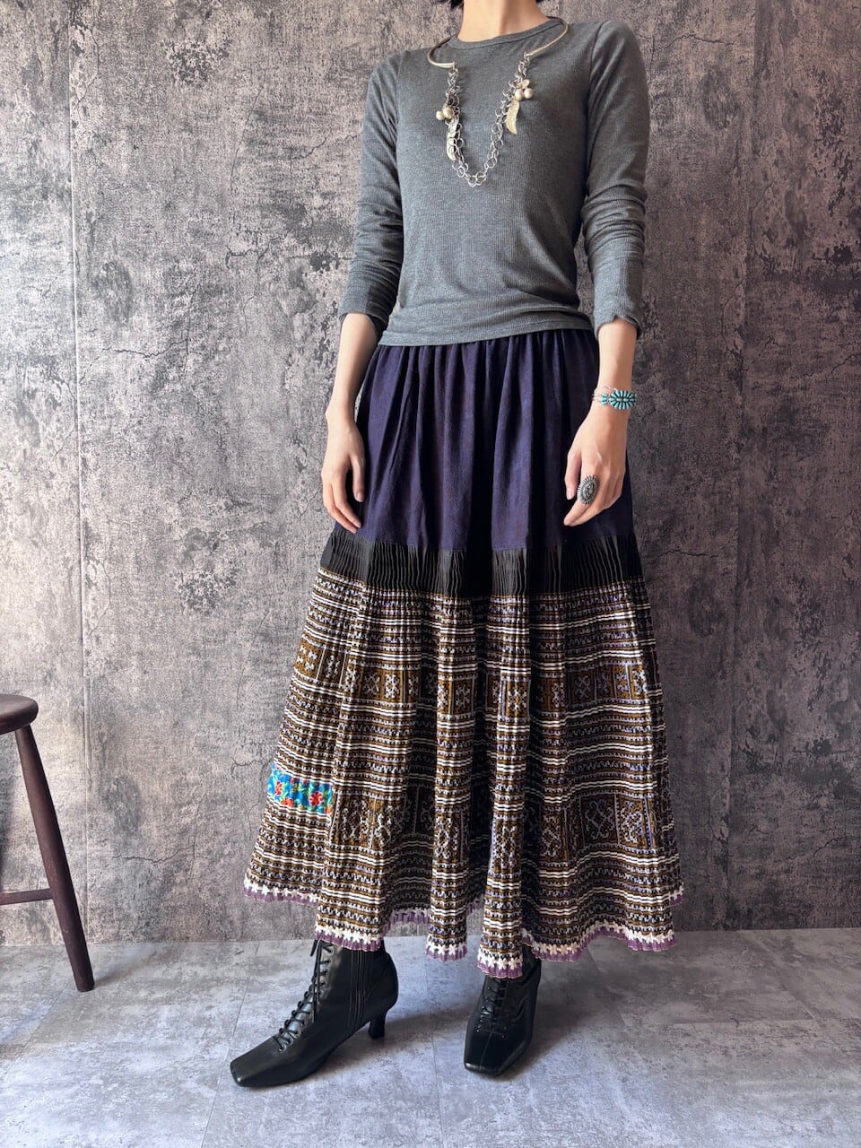 モン族の巻きスカートをリメイクした、ロングスカートです。