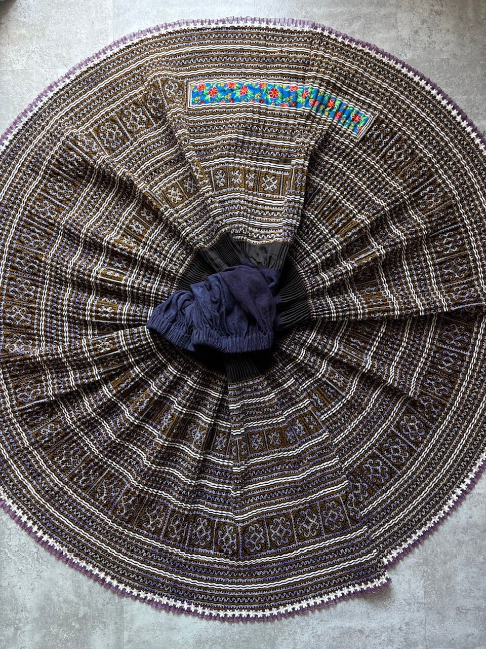 下部は黒地の生地が入り、その下は刺繍とリボンの生地です。白い糸は藍染で染まっていてパープルになっている部分があります。均等に染まっているわけではなく染めむらがあります。風合いとしてお楽しみいただければと思います。モン族ならではのモチーフの手刺繍が素晴らしいです。裾は可愛いお花のリボンが付いています。