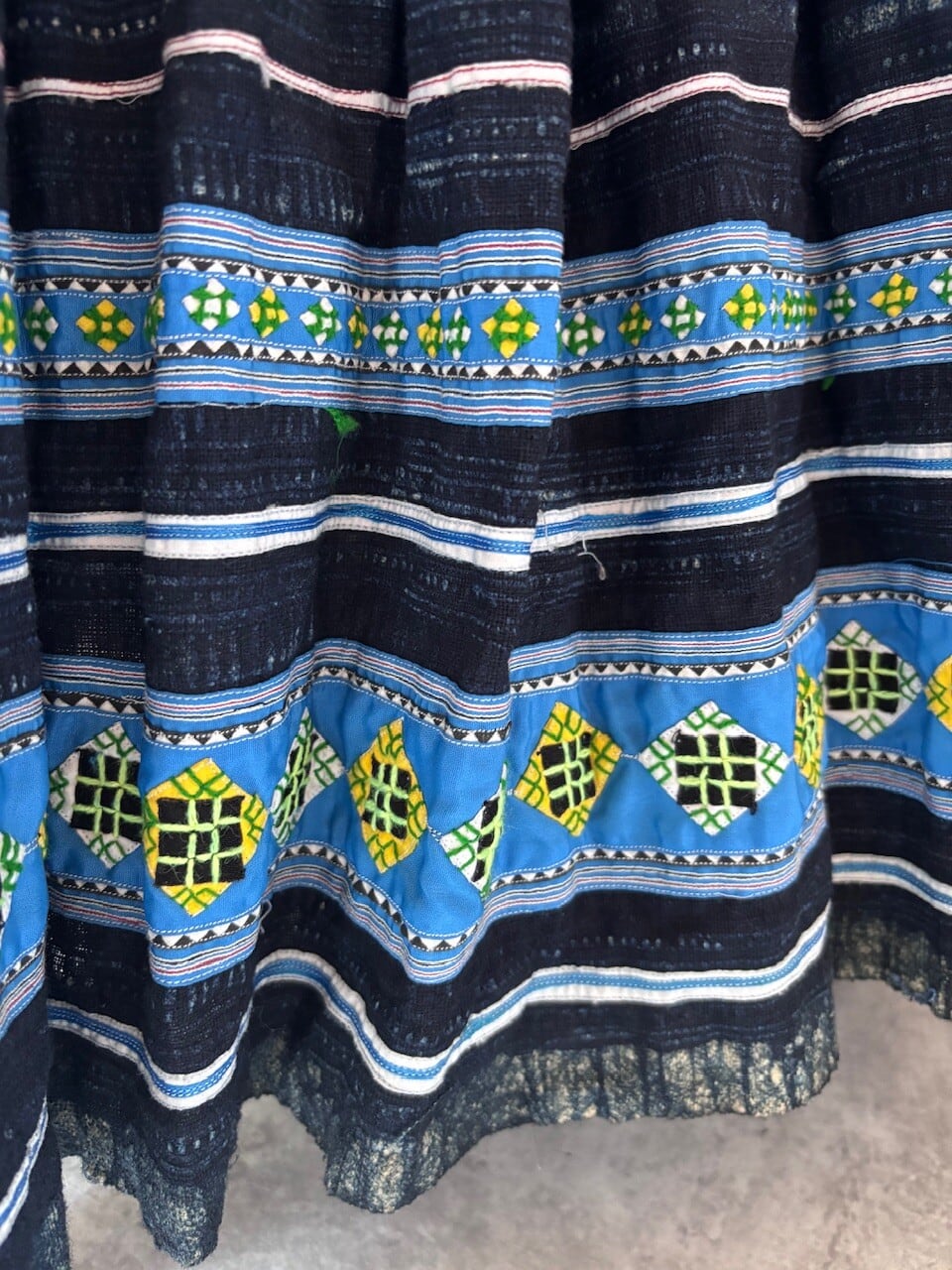 青モン族のアップリケが素敵なスカートです。