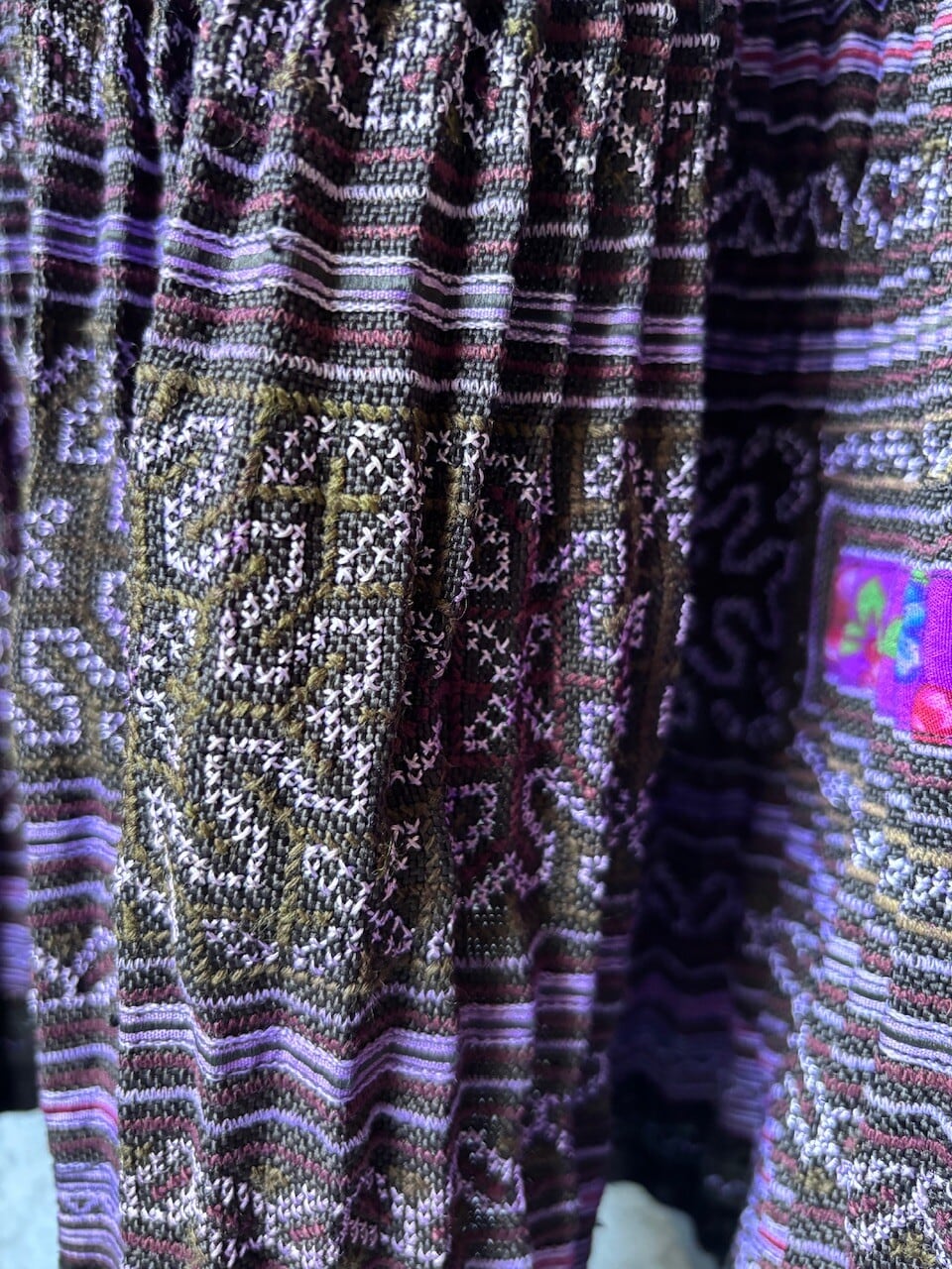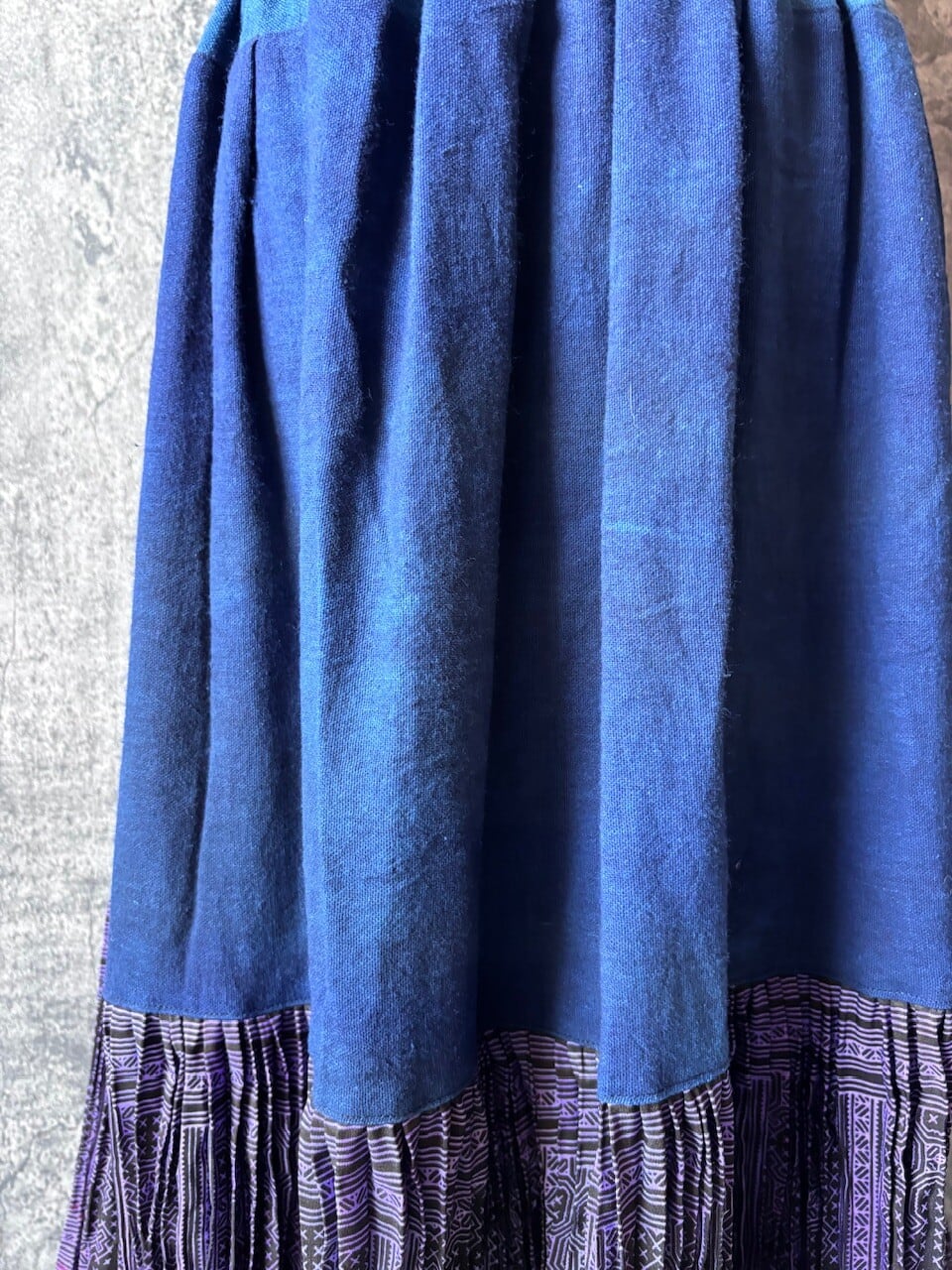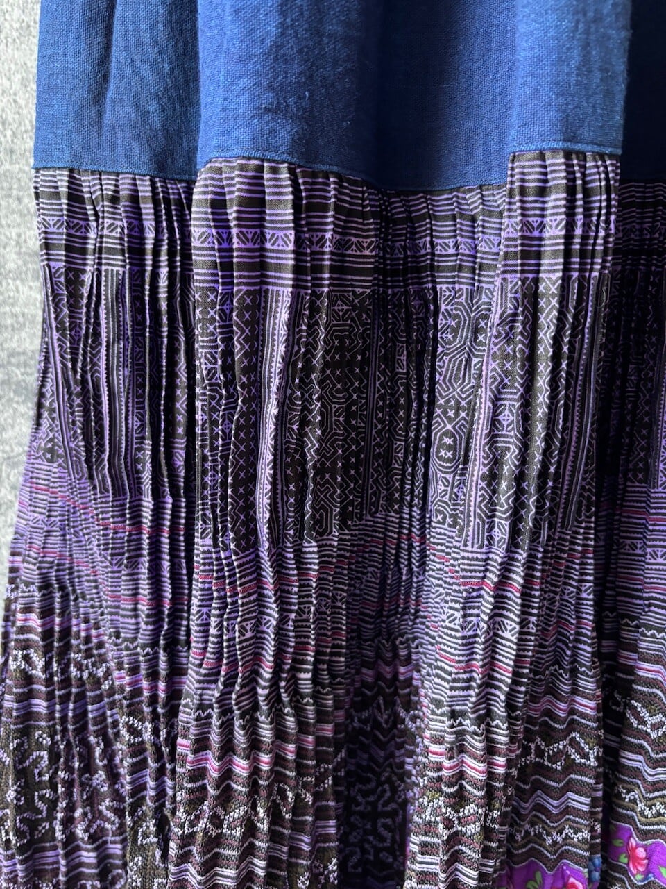 その下にはリボンやモン族のクロスステッチ刺繍とポイントに柄布が入った巻きスカート生地を使っています。
