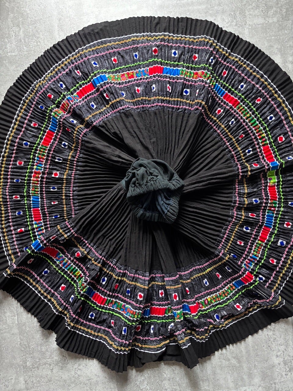 モン族ならではの手描きのろうけつ染めが素敵です。プリーツがしっかり効いていて動きのあるスカートです。