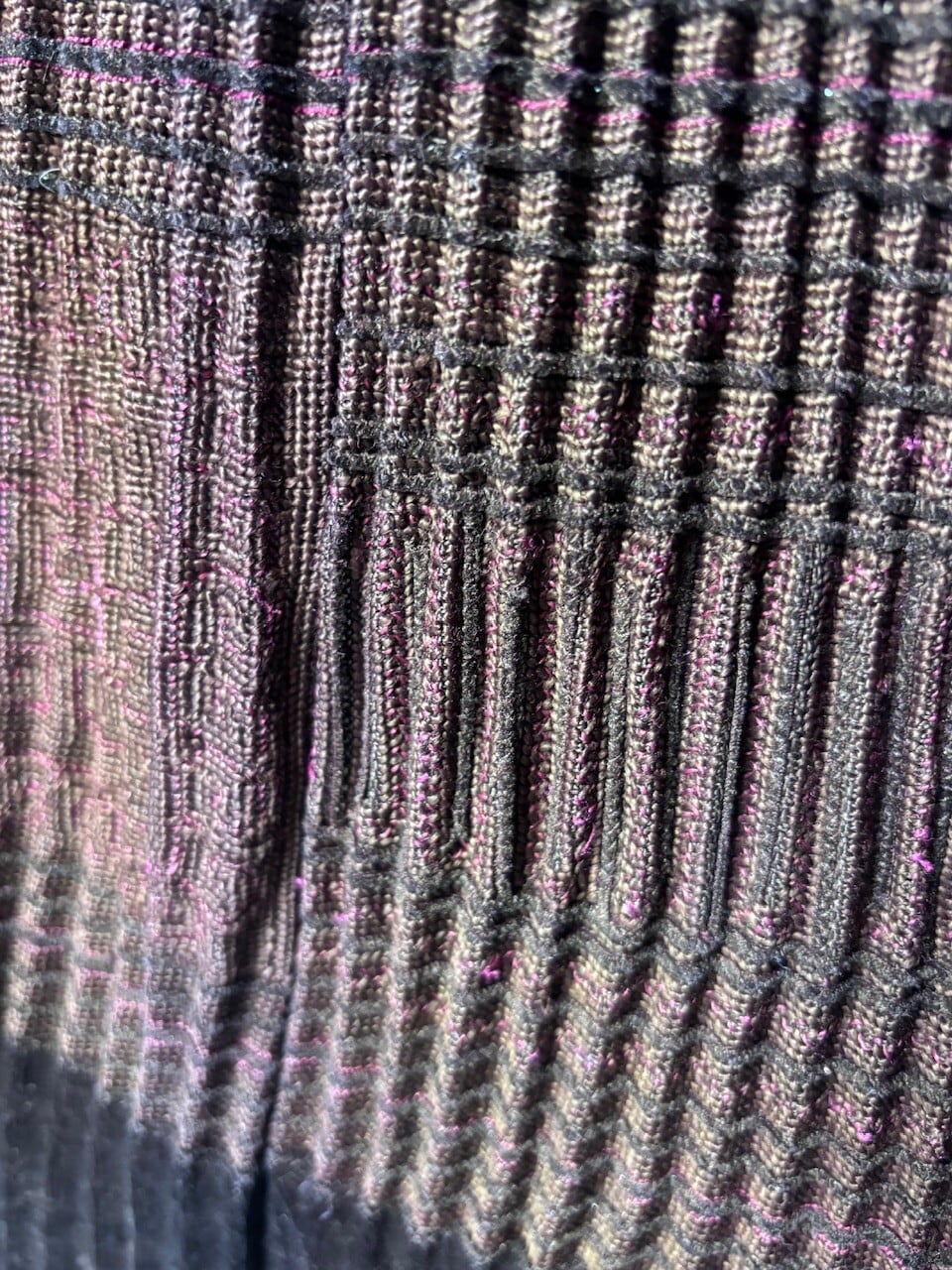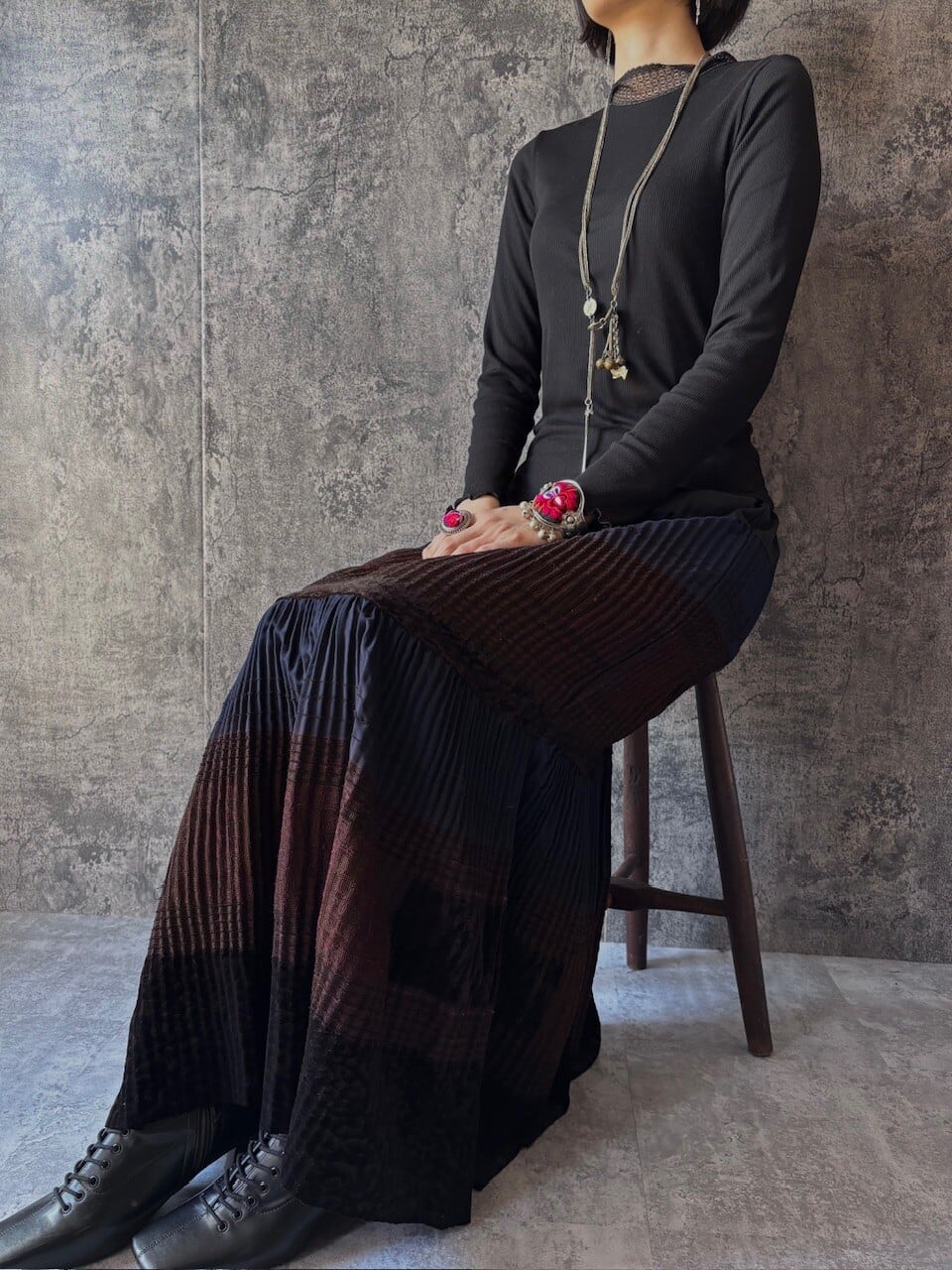 細やかなプリーツと黒~ブラウンのグラデーションが大人の装いに馴染みます。