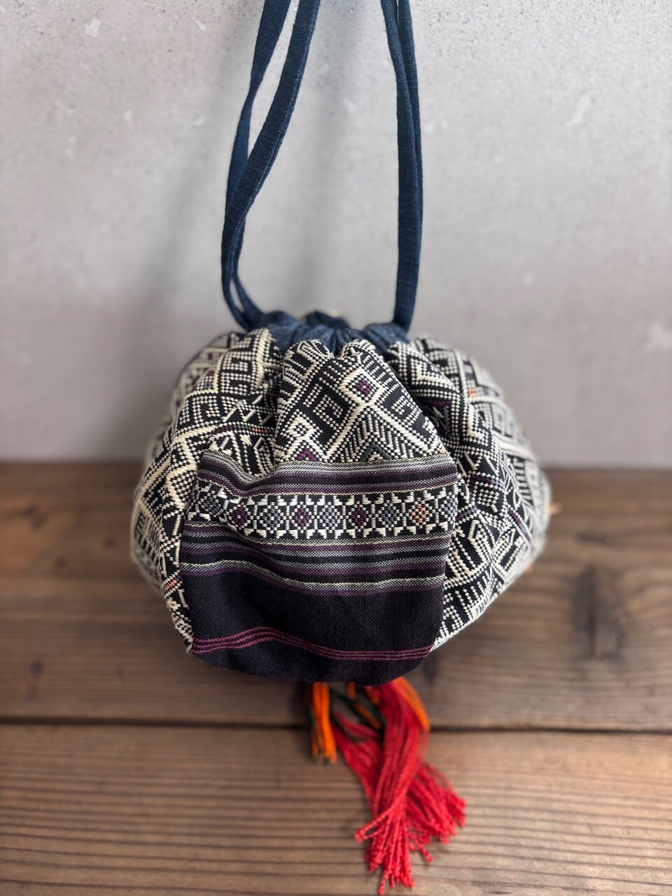 少数民族の生地で作った、巾着ミニバックです!