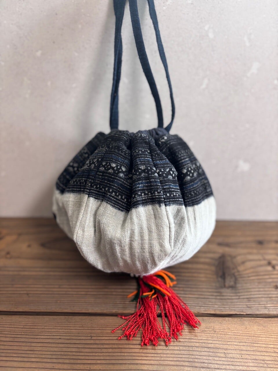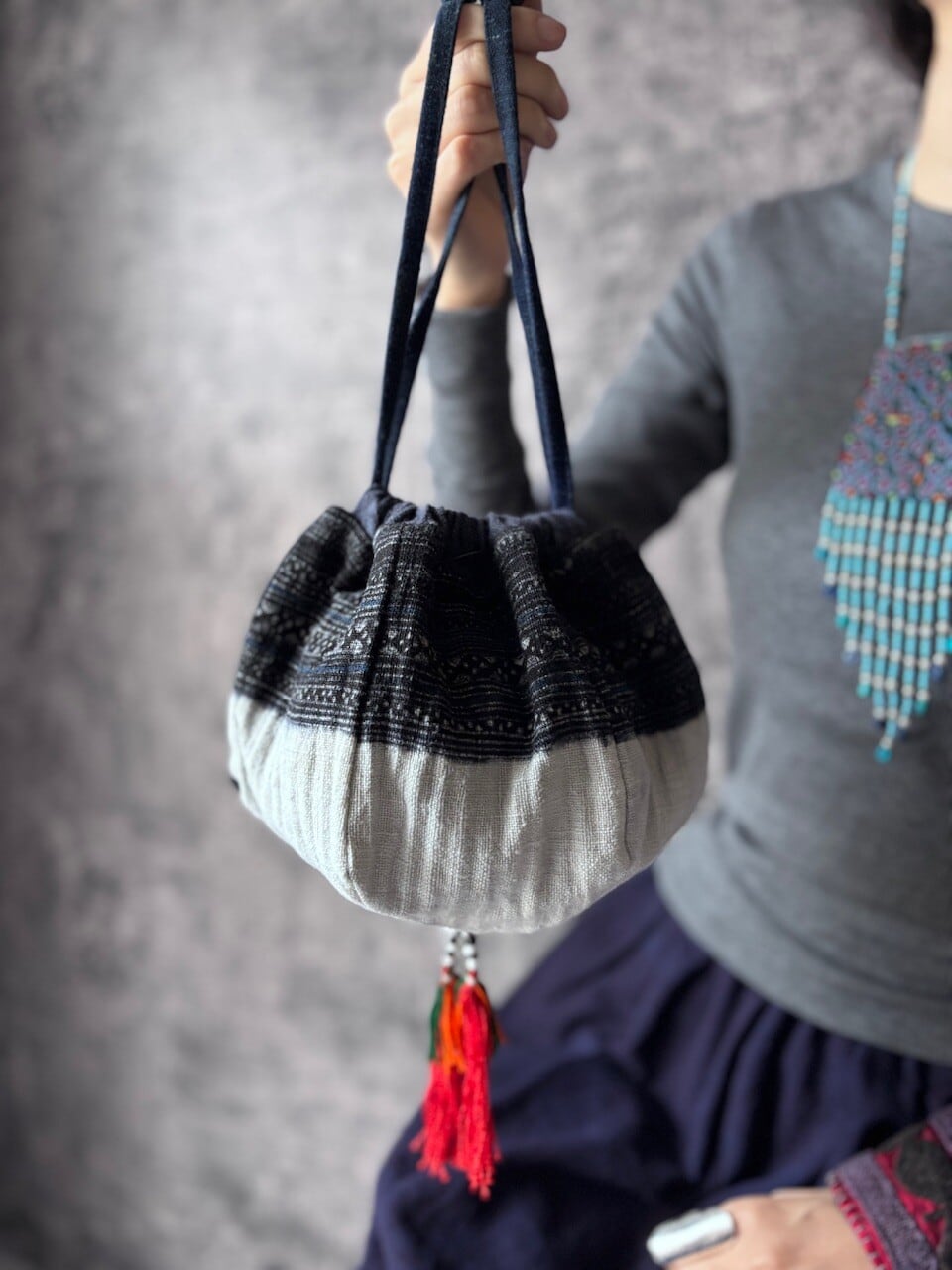このバックに使用している生地は少数民族の村より直接買い付け、仕入れたものをオリジナルでリメイクしました。